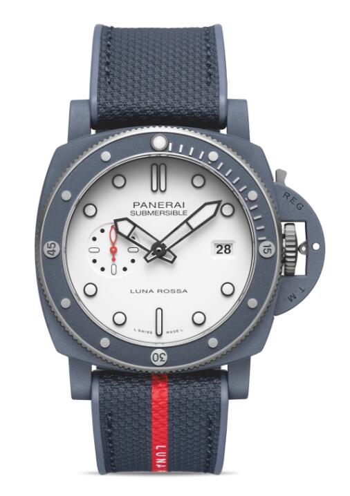 The Panerai Submersible QuarantaQuattro Luna Rossa Ti-Ceramitech super clone watches online store is available with two dials: PAM01466 has a blue sunburst dial, while PAM01543 has a grained white dial. Both replica watches come with a textile rubber strap.